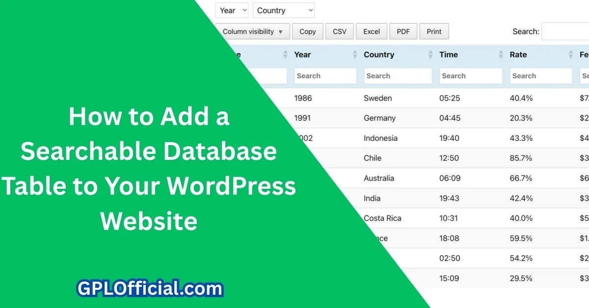 Hey, what’s up everyone? Welcome back to our website. And today, I’m going to show you how you can add a database table to your WordPress website that is searchable. So as you can see, I have a table like this, and I can filter it out through ascending or descending names, or I can sort it through years, country, and time. So you can see, we have all these options, and I can search for the data. So let’s say I want to search for, let’s say, Jackson, and here it is. So in this way, you can search for the data, and we have the pagination as well, like you can add multiple pages to the table so that it will not take up much space on the website. And you can also filter it out, like whether you want to display 10 entries per page or 20 entries per page, then you can display it like this.